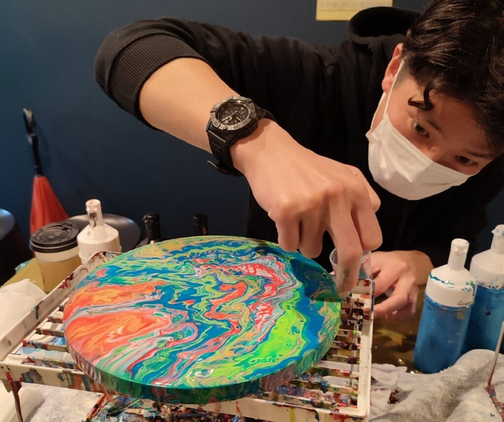 この地でのホテル開業にあたり、田辺市ゆかりのアーティスト・能登正人さんを講師に迎え、体験型のアートワークショップを開催することとなりました。能登さんは、アクリル絵の具の流動性を使って描く「ポーリングアート」というスタイルの絵画を制作されています。
