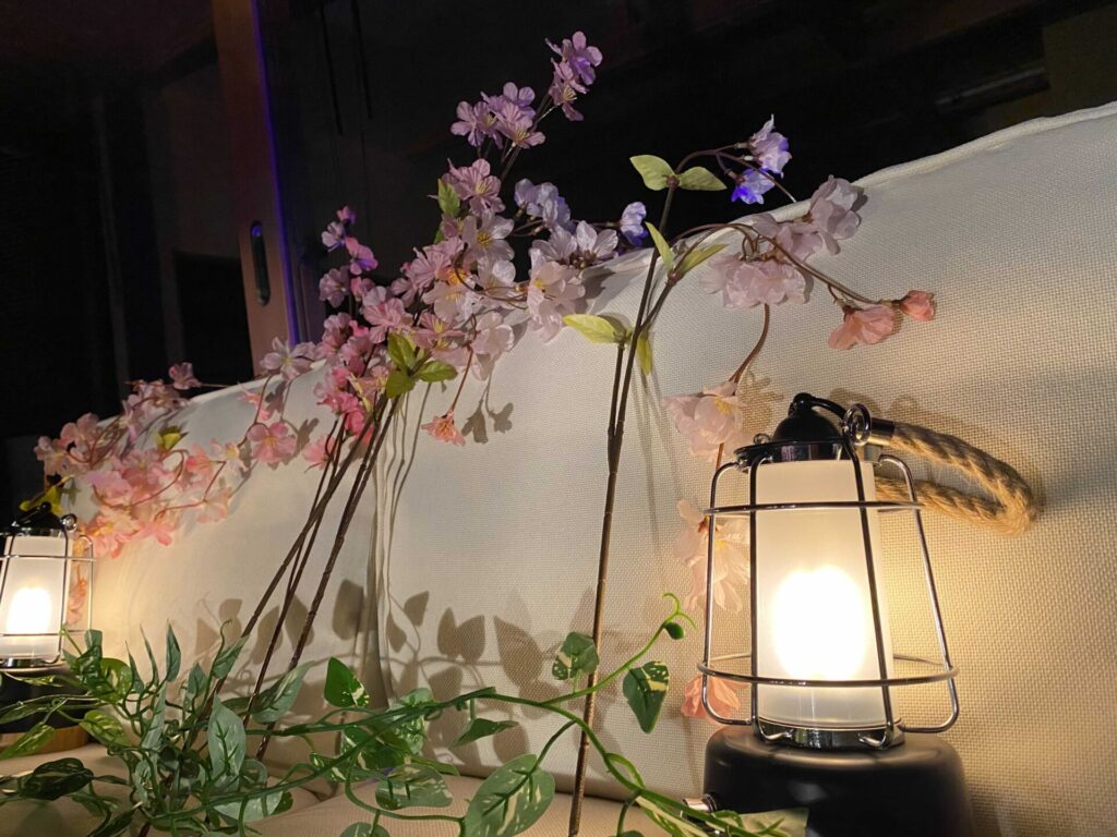 そこで、桜の造花や花瓶、ライトアップ用の照明を使って、お客様ご自身でお花見を作り上げるサービスを企画しました。照明の当て方を工夫してみたり、ガラスに映る桜を写真に収めてみたり、あなたなりの楽しみ方をぜひ探してみて下さい。