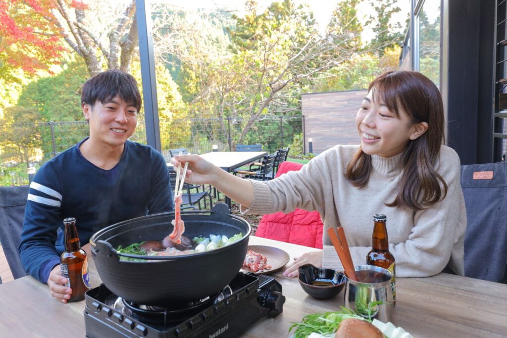 当宿は各客室にプライベートガーデンがついており、春夏秋はバーベキューなどの食材をご用意していました。2022年4月28日に開業した当宿にとって、初めて迎える冬。冬場であっても屋外テラスを活用できないか考えた結果、こたつを設置し、鍋を提供することとしました。冷たくピンと張りつめた空気に包まれながら、地の物がふんだんにそろった鍋とこたつで身体を芯から温め、冬の自然を楽しむ新たな体験をご堪能ください。