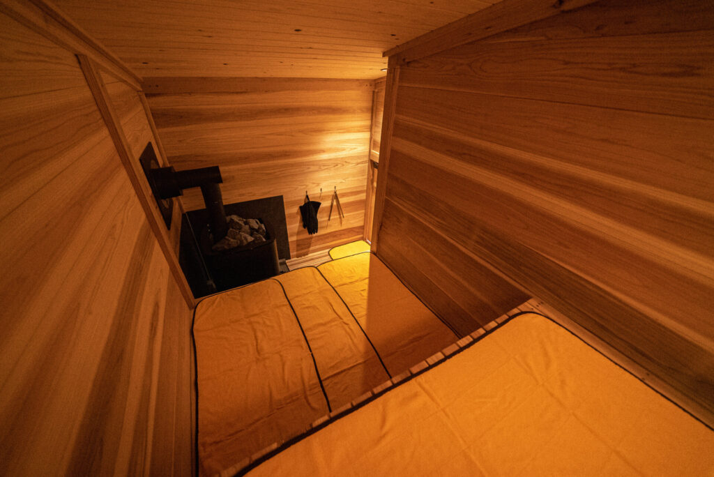 サウナ内はあえて照明をあまり入れず、ほの暗い空間で禅や瞑想のように”無になる瞬間”が生み出されるようにしています。家族や仲間と一緒にいながらも、自分自身と対話する時間を持てる空間となっています。