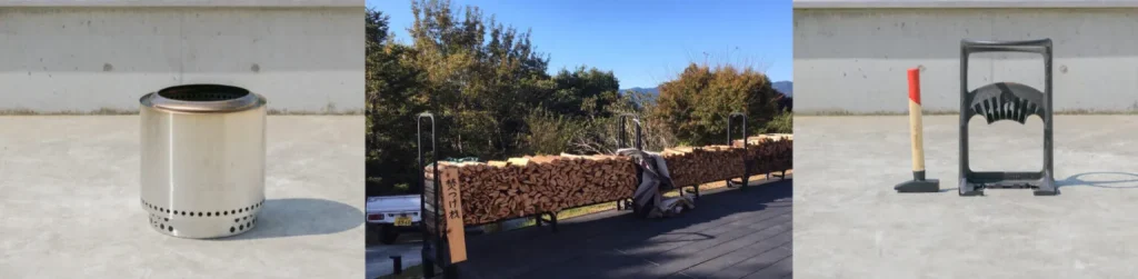 焚き火用品一式:薪、キンドリングクラッカー(薪割機)、ソロストーブ、着火剤、チャッカマン