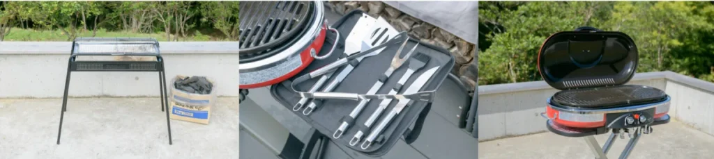 BBQ用品一式:BBQ用コンロ2台(ガス・木炭各1台)、ガスコンロ用ガス、木炭、着火剤、トング類、軍手、チャッカマン