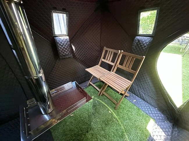 TAKAHARAに続き、CHIKATSUYUでも将来的にサウナを設置したいと考えていることから、6~7月限定でテントサウナのデモンストレーションを行いました。この試験期間で多くのお客様から好評をいただいたことから、この度、本格的にテントサウナを導入することとなりました。